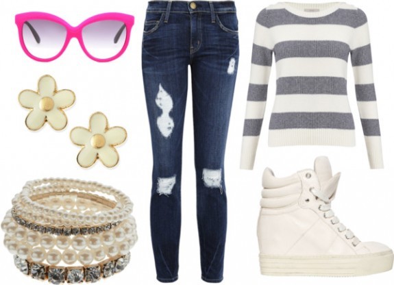 Pearls are commonly known to compliment more upscale evening pieces or professional clothing like dress suits. They are not commonly associated with casual wear, so I completely understand you inquiry. Pearls can be styled with causal looks like the look above featuring a gray and white striped sweater, dark blue distressed jeans, pink statement cat-eye glasses, a pair of simple white wedge sneaker boots, flower earrings, and a perfect combination of layered rhinestone and pearl bracelets.